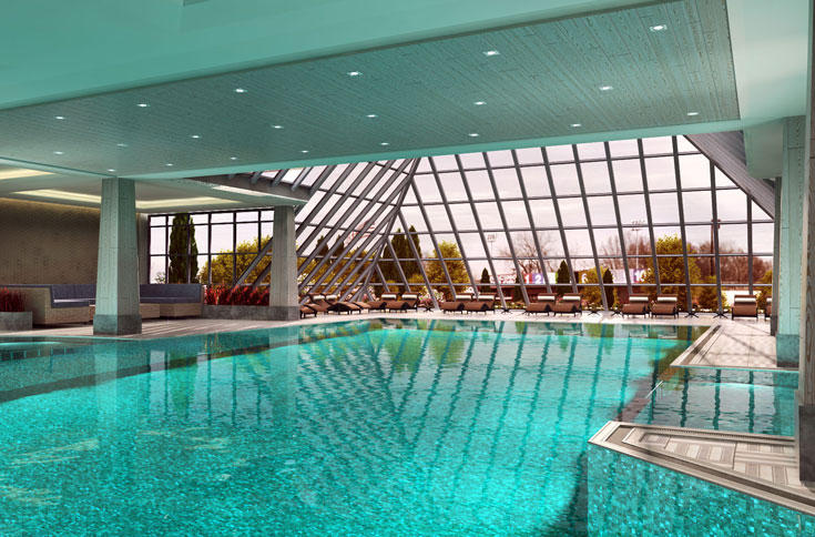 The complex located in Aktau, a city of Kazakistan has 7350m2 designed with two glass pyramids combining with a concrete structure to build two seperate zones with two different functions.In Spa Zone, there is one open and one indoor pool,a traditional hamam,sauna,steam rooms,resting areas.With the same enterance,you can lead to fitness areas upstairs including Man Fight sports,Aerobics,Pilates,Yoga,Children play areas.All the architectural and interior designs of spaces has been executed and followed through in one year.The Entertainment Zone has been located inside the other pyramid and included night club and lounge areas.The complex has opened in 2015