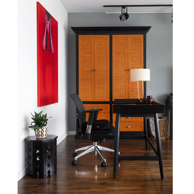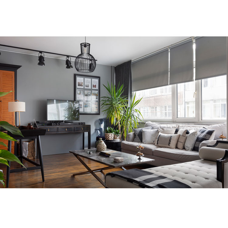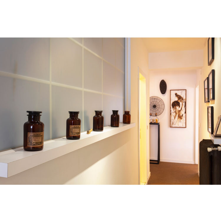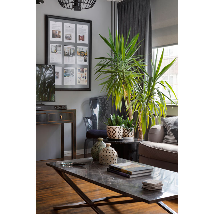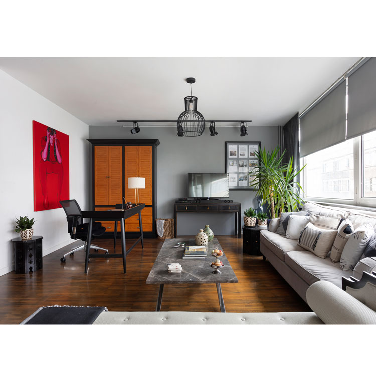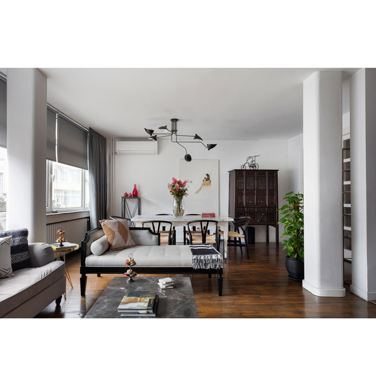 When approaching the decoration, I envisioned a contemporary setting where I could display plenty of art while also integrating antiques and vintage objects. To achieve this, I kept most of the walls white and opted for track spot lighting. Painting the walls and ceiling in white and avoiding crown moldings gave the rooms a more spacious, higher-ceilinged feel. Simple skirting boards and doors provided a neutral backdrop, creating balance with the classic furniture and pieces of my own design that I later introduced. For the television wall, I chose a single dark gray tone and complemented it with darker furnishings. Between the seating and dining areas, I placed a custom-designed daybed. This low piece of furniture helped define the functions while also enhancing the sense of openness in the living room.