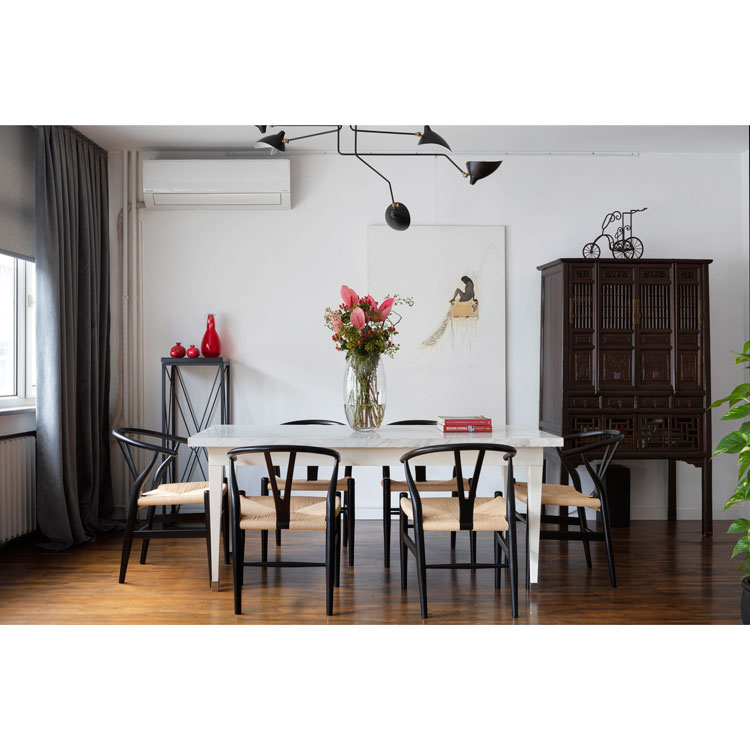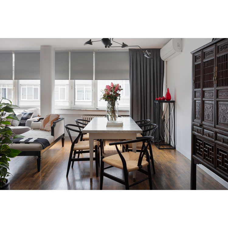 The living area overlooking the street is about 40 m² and enjoys wonderful natural light. For the dining table, I specifically chose marble. Beyond its elegance, marble has proven extremely practical for daily use and especially convenient when hosting dinner gatherings.