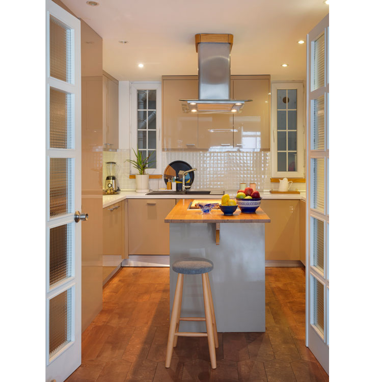 Another major transformation took place in the kitchen. The original kitchen, facing the lightwell, was only a third of its current size. Like many old Teşvikiye apartments, it also featured a separate service entrance with an attached corridor, which wasted considerable space. I removed all those corridors and reimagined the space as a large, U-shaped, island-style kitchen that now opens directly onto the living area.”