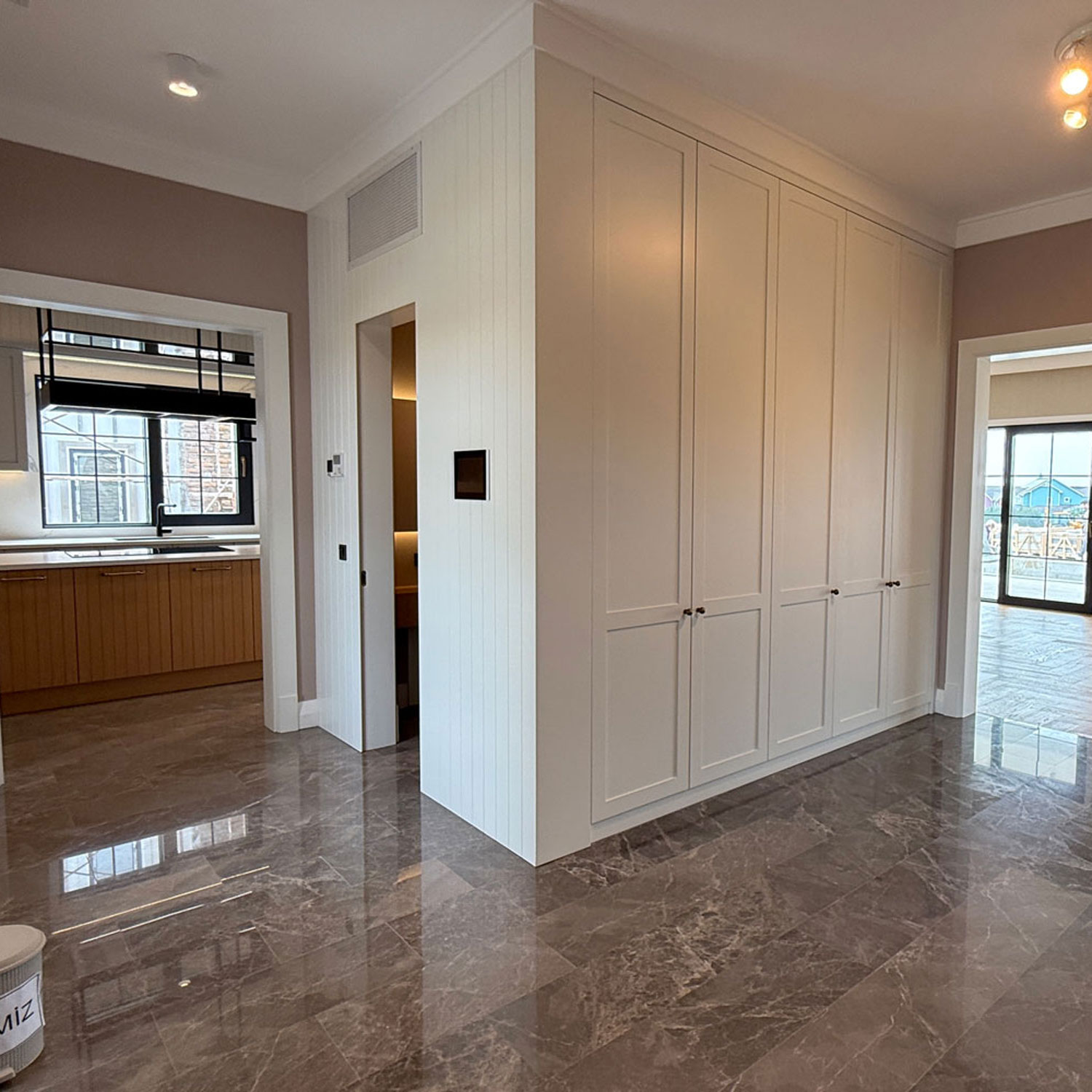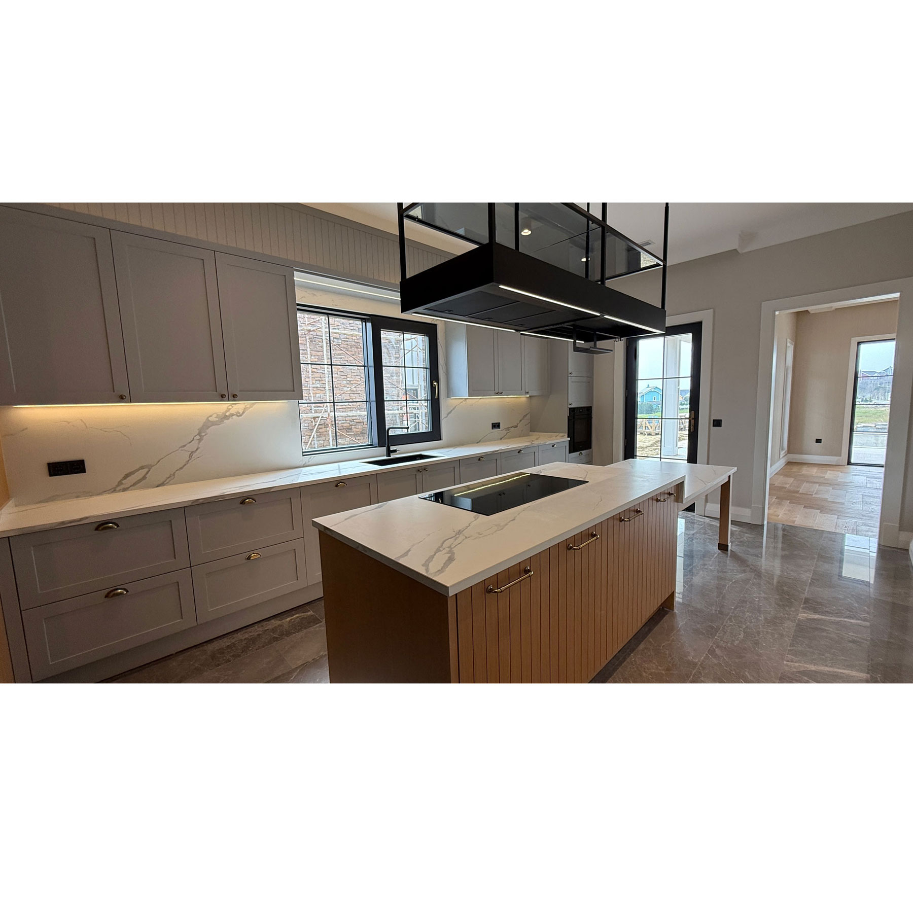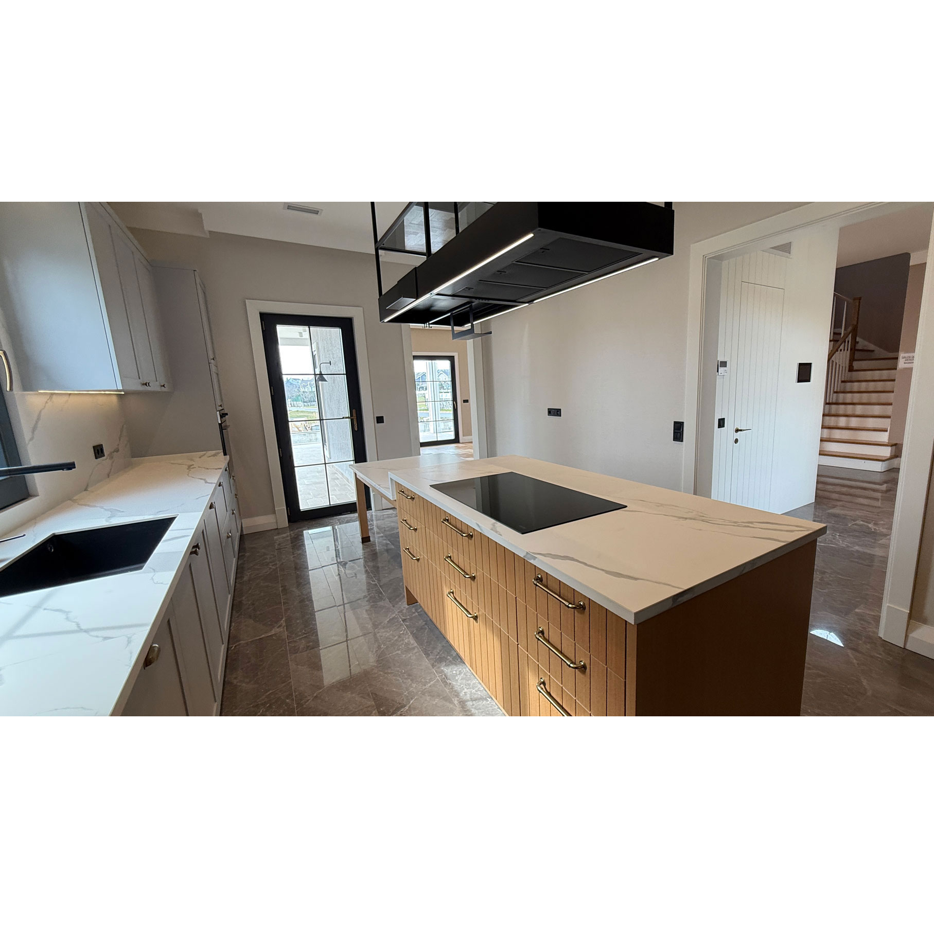 23m2 geniş mutfaktan hem salona hem de bahçe verandasına direkt çıkış vardır.Bu mutfakta buzdolabı ve mikrodalga alanları duvara gömülü fugalı meşe kaplama,geri kalan mobilya alanları açık gri lake olarak tasarlandı.