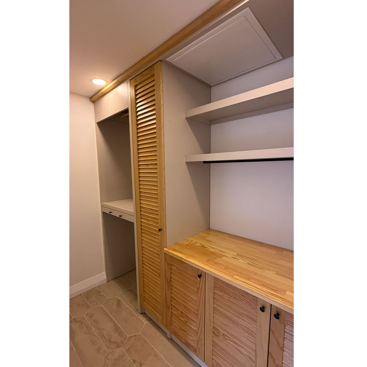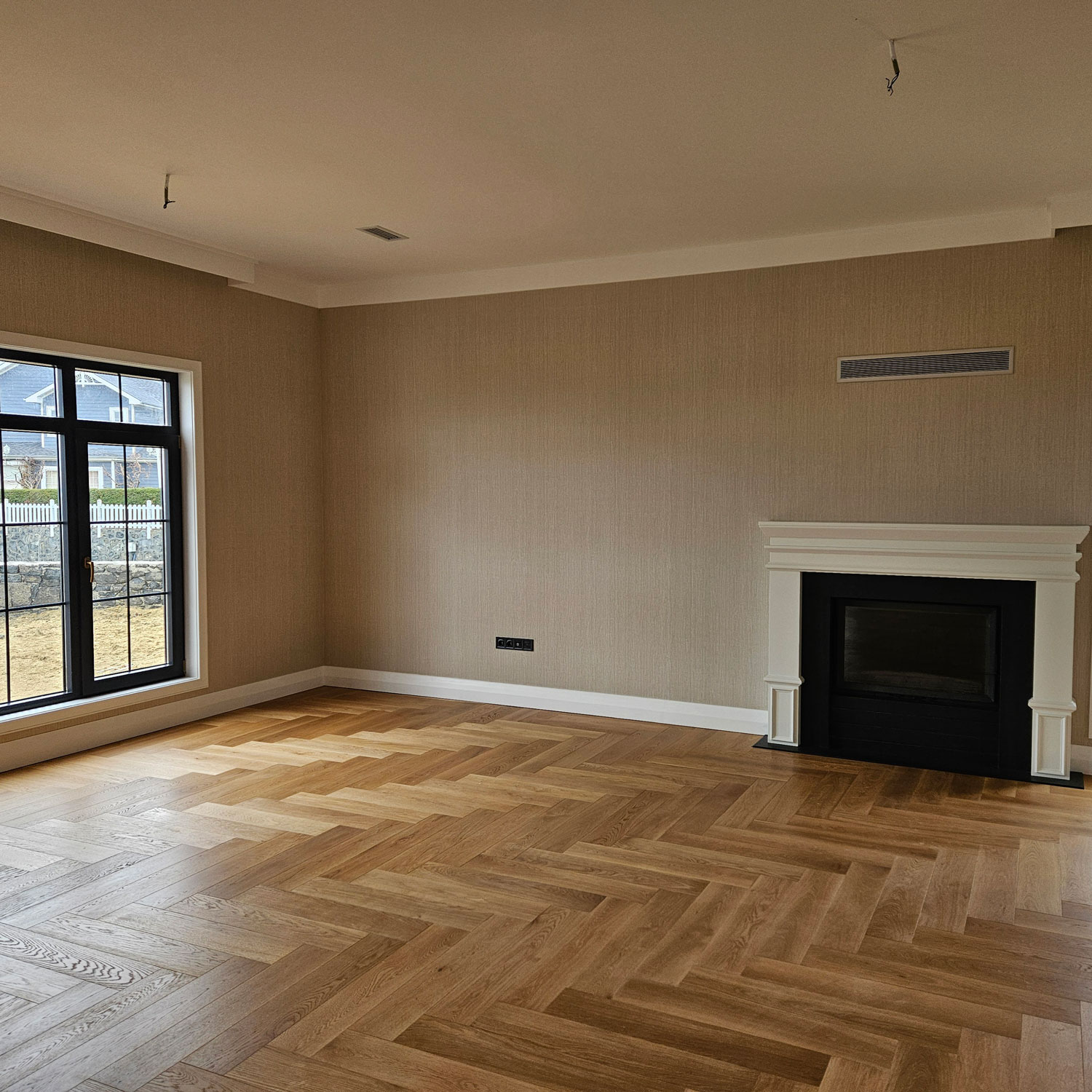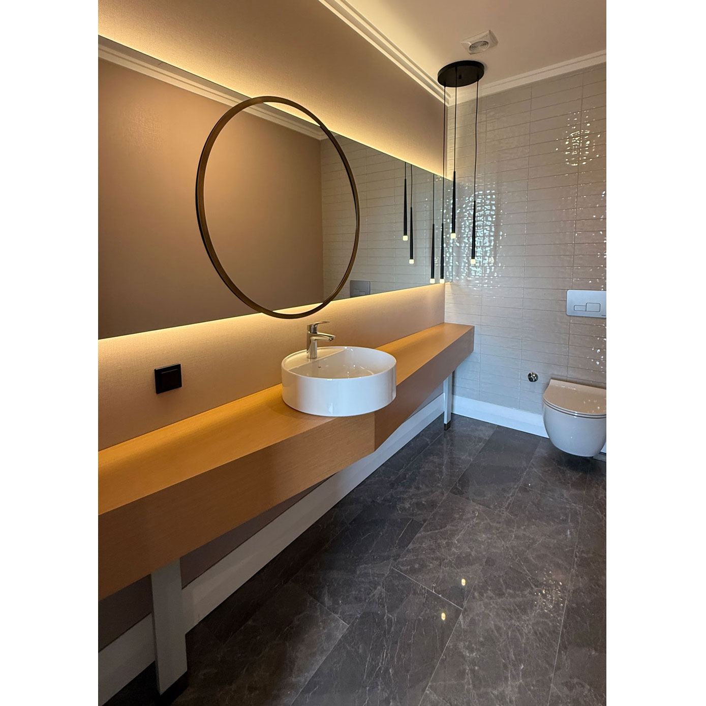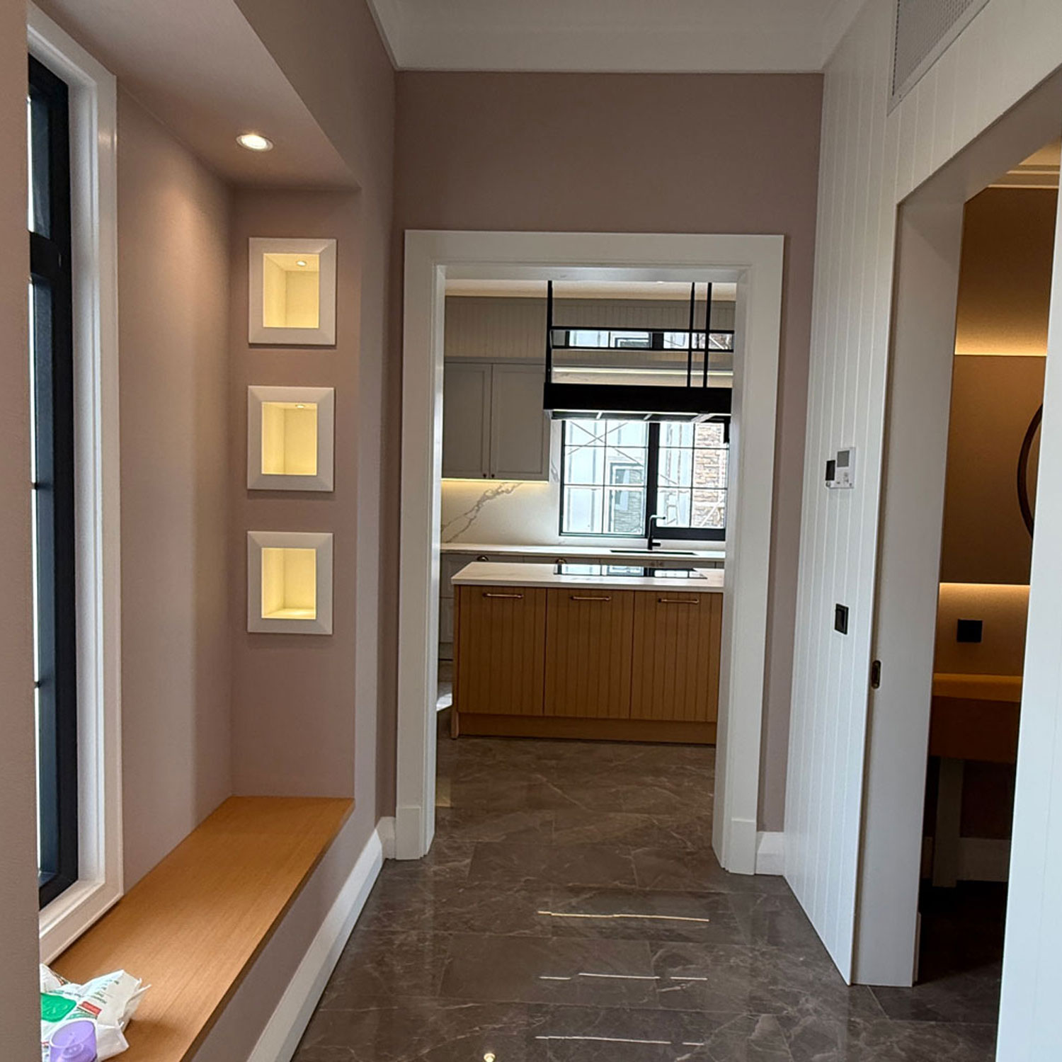 23m2 geniş mutfaktan hem salona hem de bahçe verandasına direkt çıkış vardır.Bu mutfakta buzdolabı ve mikrodalga alanları duvara gömülü fugalı meşe kaplama,geri kalan mobilya alanları açık gri lake olarak tasarlandı.