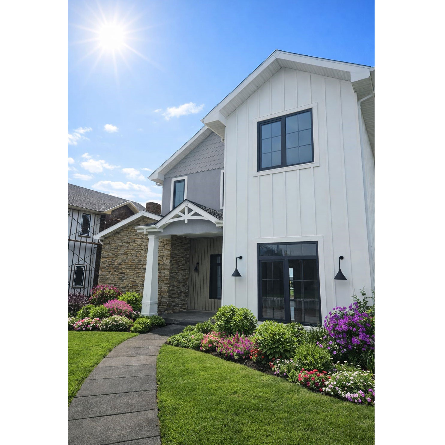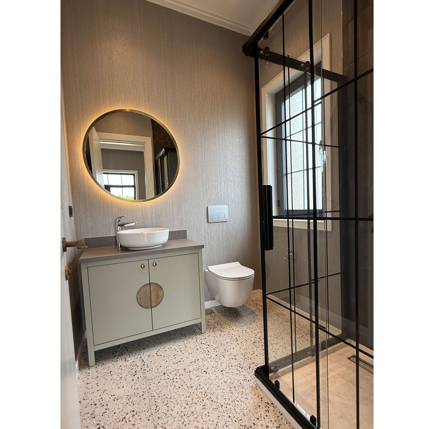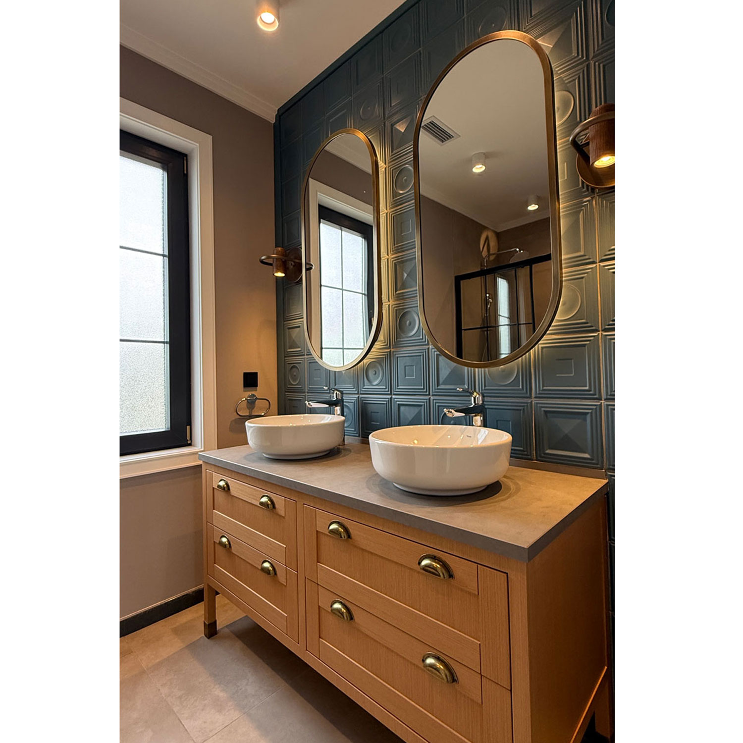 Saral İnşaat için tasarladığımız, toplam 10 adet geniş metrekareye sahip Sunflower sitesi içinde yer alan bu yeni tasarım villalarda mimarımız Leyla Doğrular, gün ışığına daha çok yer açarak iç ve dış mekan ilişkisini pekiştiriyor. Bu evlerde denizi ve gün batımını gören balkonlar ve bahçeye açılan geniş verandalar açık alanların bolca yaşam alanlarına katılması öngörüldü.Villanın ön veranda alanında (10m2) evin yeni tasarımına uygun fugalı dikey kompakt laminat duvar kaplaması ve özel üretim çelik giriş kapıları ile bu alanın dekorasyonu sağlandı.İç antre ve merdiven holünde (19m2) gri damarlı mermer ve meşe kaplama zemin malzemelerine, duvarda, tavana kadar beyaz lake kaplama portmanto dolabı ve lake duvar lambrileri eşlik ediyor.Misafir Wc bu alanda konumlandırıldı ve geçiş holünde, pencere önü oturma seti ve nişleri eklendi.